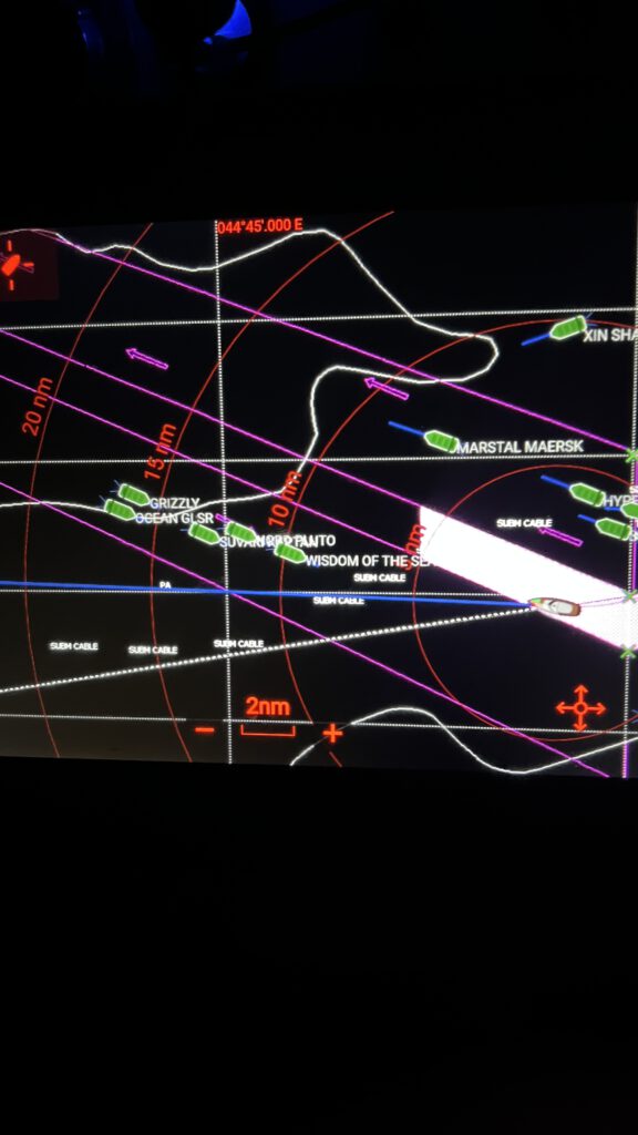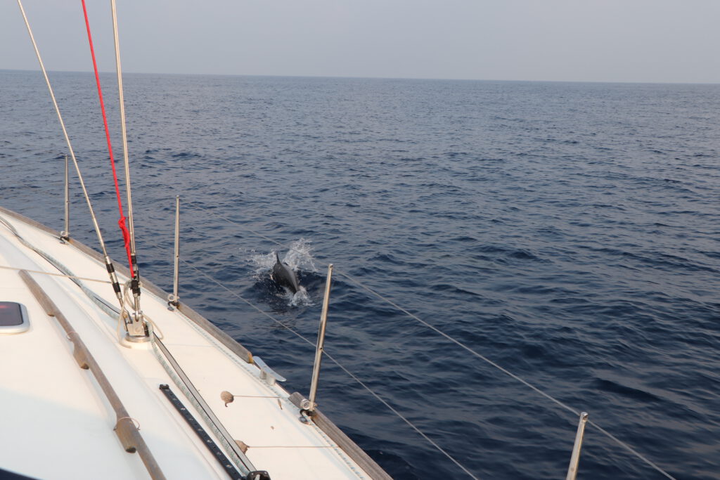 Am Tag darauf erreichen wir dann die Einfahrt in den sogenannten überwachten Korridor im Golf von Aden. Mittels von den Militärs festgelegten Koordinaten wird dabei durch den gesamten Golf von Aden eine virtuelle, mehr als 700 Seemeilen lange Autobahn für die Schifffahrt eingerichtet. Auf der nördlichen Seite fährt die komplette kommerzielle Schifffahrt wie wir nach Westen Richtung Rotes Meer und auf der südlichen „Fahrspur“ geht es raus aus dem Golf von Aden Richtung offener indischer Ozean. Wir Segler dürfen uns dabei in der Mitte zwischen den beiden Fahrspuren, sozusagen am Grünstreifen dieser Autobahn, bewegen. So ist sichergestellt, dass die Sicherheitsbehörden zum einen den Verkehr gut kontrollieren können aber vor allem auch die Schifffahrt untereinander gut aufeinander aufpassen kann. Ab der Einfahrt in diesen Korridor haben wir immer mindestens einen Frachter oder Tanker in Sichtreichweite und können uns – wie wir an Funksprüchen erkennen – auch sicher sein, dass die Großen auf uns kleine Segler ein wohlwollendes Auge haben. Zu einer positiven Stimmung an Bord trägt auch bei, dass wir in unserer direkten Nähe drei andere deutsch/österreichische Boote haben, die im Verbund segeln und uns gut austauschen können. Noch schöner ist aber eine Begegnung mit dem deutschen Boot „Rosa II“. Kurz nachdem wir in den Korridor einbiegen überholen wir das andere Boot und fahren aufgrund der klar markierten Position der Schiffahrtsautobahn mit nur wenigen Metern Abstand und in Rufreichweite aneinander vorbei. Nach vielen Tagen virtueller Kommunikation über E-Mail und der Anspannung ob dieses Seegebietes tut der kurze direkte Austausch richtig gut. Wir freuen uns, dass wir mit der Einfahrt in den überwachten Korridor mehr als die Hälfte dieser Überfahrt geschafft haben und es uns und der Sea Pearl noch gut geht.