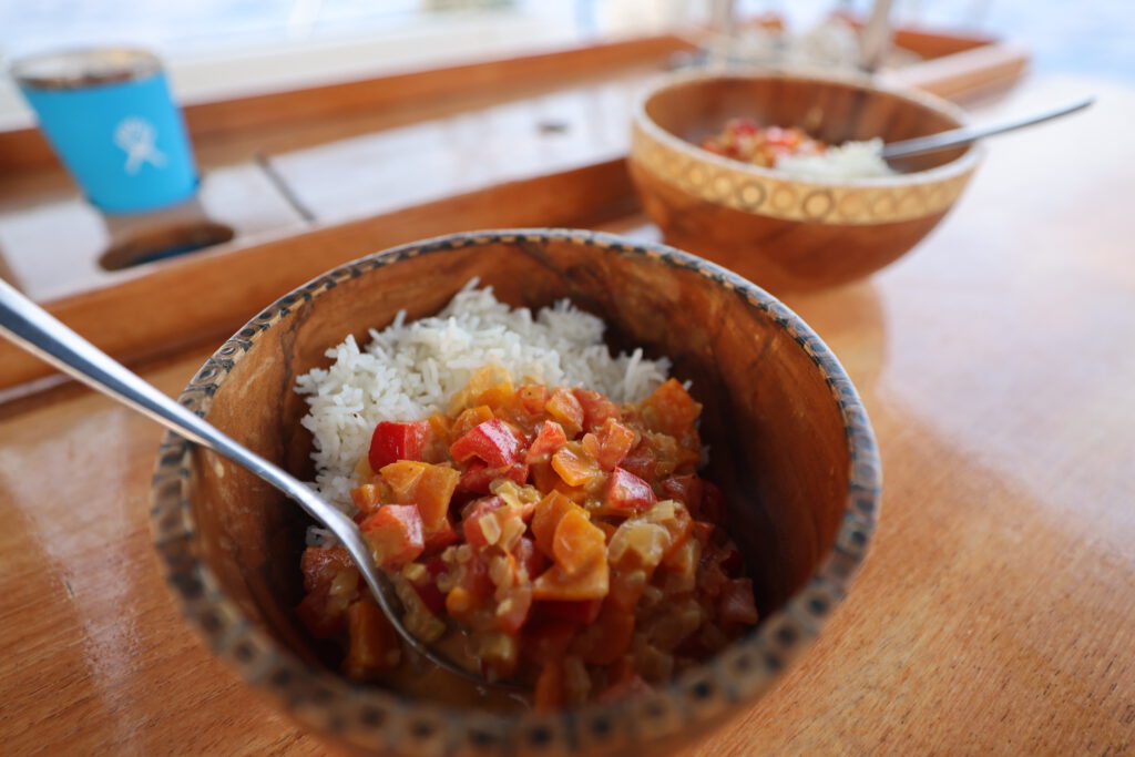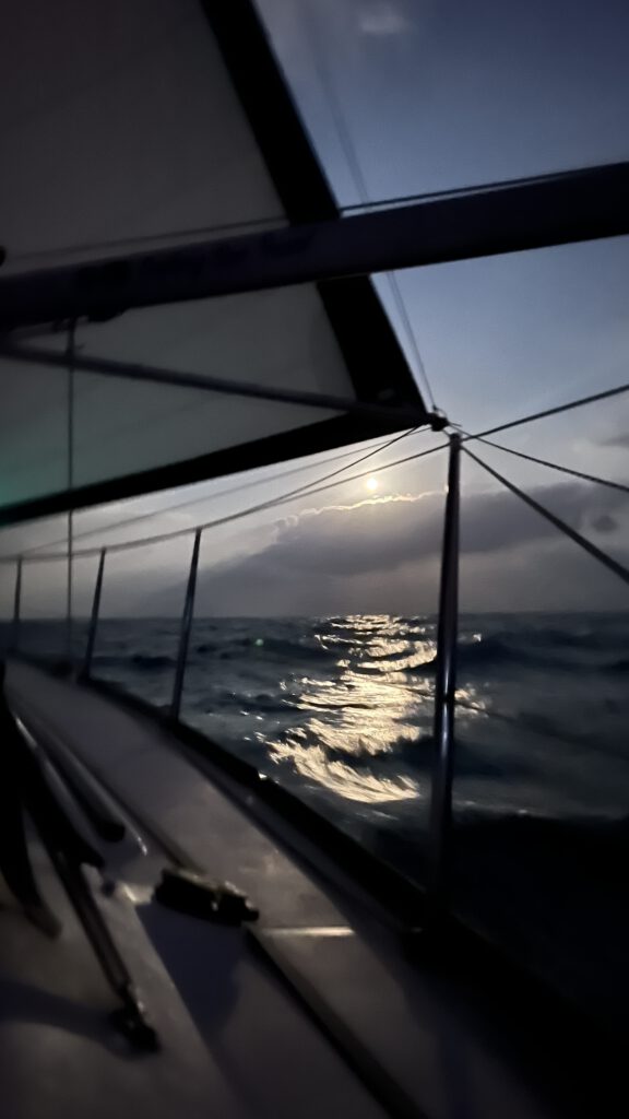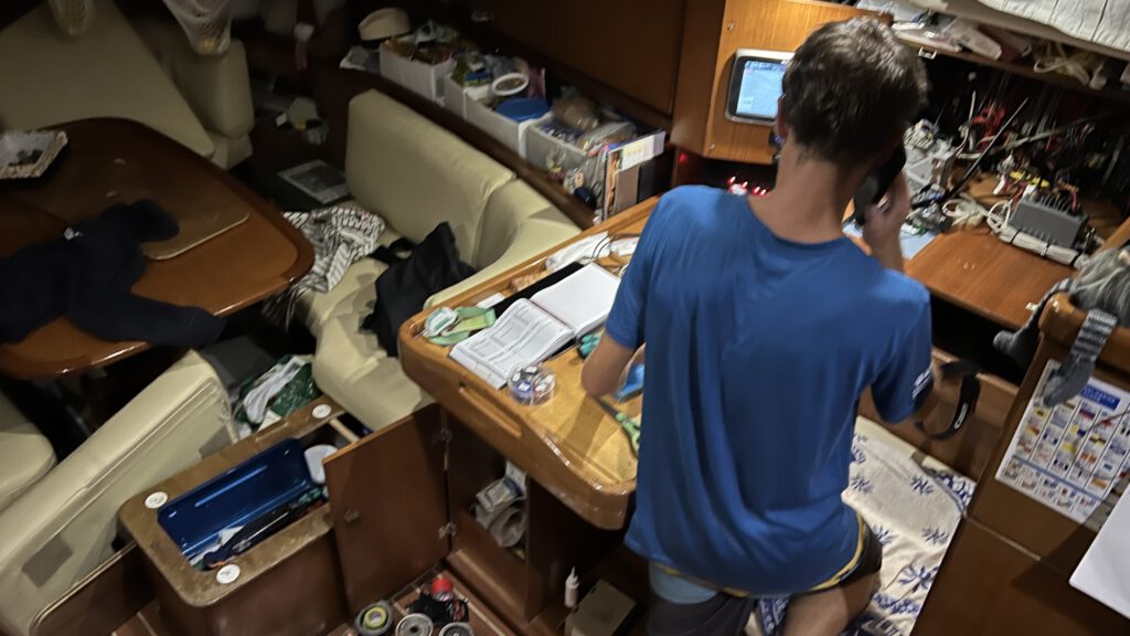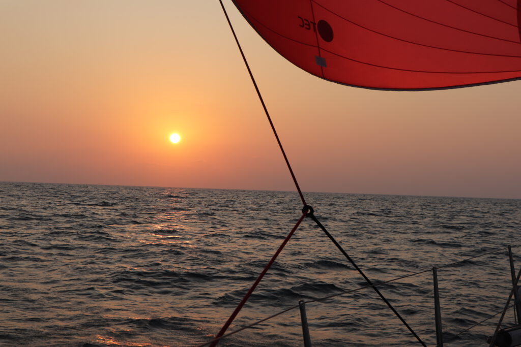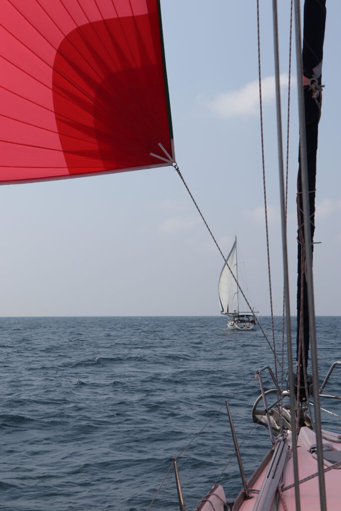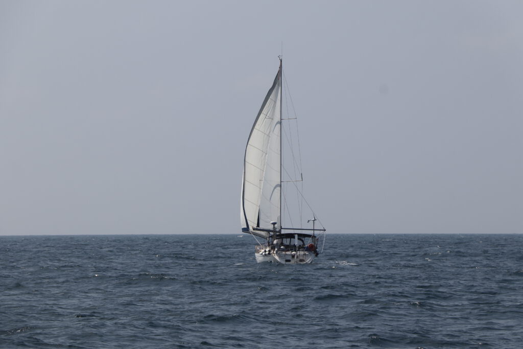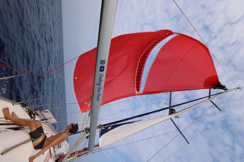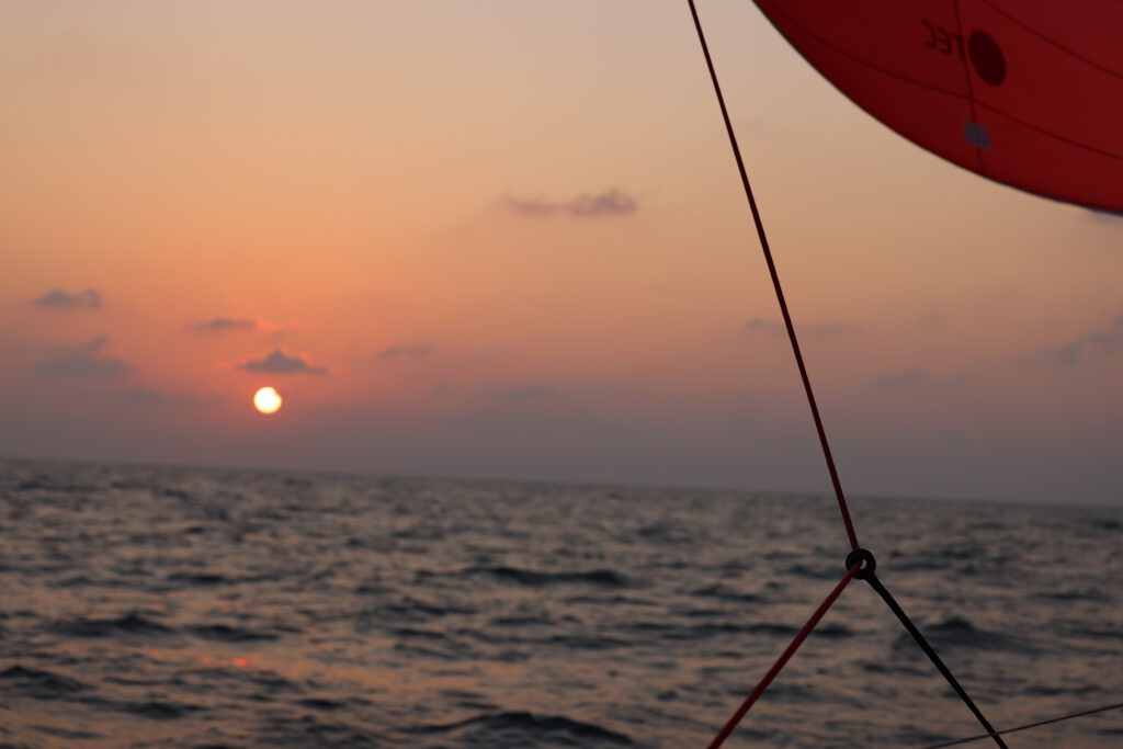 Bei entspannten Wetter-Bedingungen aber innerlich im Hab-Acht-Modus starten wir also ab den Malediven. Zunächst bei tollem Segelwind und dann genau wie angekündigt für etwas mehr als einen Tag unter Motor. Anschließend spielt unser Parasailor seine Stärken aus. Wir haben relativ leichten Wind von Achtern oder der Seite und können ganze Tage mit dem riesigen großen Segel wunderbar Strecke machen. Wir grooven uns so ganz gemütlich in den Rhythmus einer Passage zu zweit. Im Gegensatz zu den Passagen mit Mitseglern müssen wir doch etwas mehr darauf achten unser Schlafbudget zu erfüllen und die ganz normalen Tätigkeiten wie Essen vorbereiten, kochen, Wartungen an Bord und die Navigation nehmen mehr Zeit in Anspruch. Zusätzlich kommunizieren wir intensiv nicht nur mit den Behörden sondern auch mit den anderen Booten unseres Konvois. Das entspannte und sehr stabile Wetter macht es uns dabei aber einfach.
