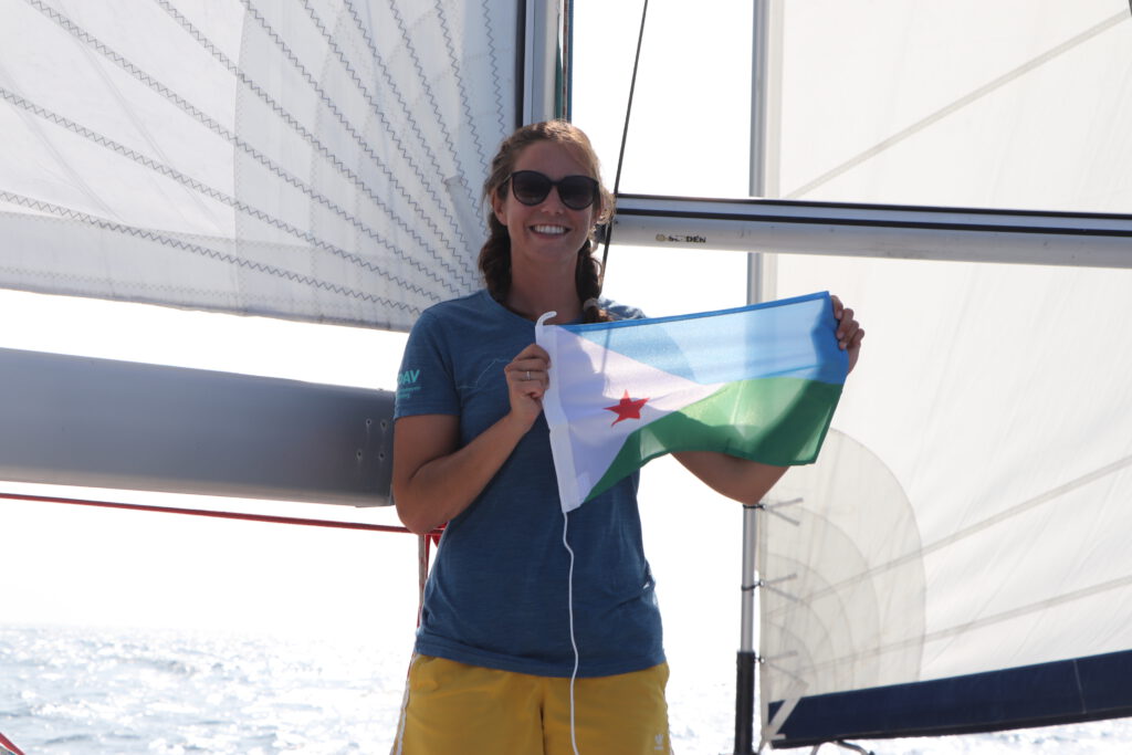 Am kommenden Morgen erschrecken wir kurz: wir sehen ein Militärflugzeug in unsere Richtung fliegen. Kurz danach werden wir über Funk angesprochen. Es folgen zwei Überprüfungsfragen, um sicherzugehen, dass wir auf der Sea Pearl nicht zum Beispiel bereits gekapert sind. Anschließend erkundigt sich die Besatzung des Flugzeugs nach unserem Befinden und ob wir irgendetwas seltsames gesehen hätten, während die Maschine Kreise um uns fliegt. Nach erfolgreichem Check geht es weiter zum nächsten Segler vor uns, dessen Antwort wir zwar nicht hören, wohl aber die Fragen und Funksprüche der Militärmaschine. Das Gefühl wird immer besser. Wir befinden uns jetzt im denkbar dichtesten Überwachungsnetz. Weil auch die Sichtungen oder Annäherungen von Fischern hier im Korridor fast ausbleiben, können wir uns zunehmend entspannen. Eigentlich seltsam, wir nähern uns immer weiter der somalischen Küste und damit der realen (früheren) Pirateriegefahr. Aber wegen der spürbaren Präsenz der Sicherheitsbehörden und der scheinbaren Sicherheit die die Gruppe an Seglern und die Großschifffahrt bietet, fühlen wir uns besser als bei Abfahrt von den Malediven. Es war also richtig, dass wir uns unter das militärische Protokoll für dieses spezielle Seegebiet gestellt haben – zumindest fühlt es sich für uns gut an. Die Passage im Korridor ist für uns ein reiner Vor-Wind Kurs. Nachdem wir ja aber genau zwischen den Fahrspuren der kommerziellen Schifffahrt bleiben müssen, bauen wir unseren Windpiloten ab, setzen die Segel als Schmetterlingsbesegelung und steuern unter Autopilot gerade innerhalb des Korridors. Die letzten fünf Tage bis zur Ankunft in Dijbouti verfliegen so recht schnell. Das Wetter ist stabil und der Wind kommt mal mehr mal weniger stark von hinten. Wir geben regelmäßig unsere Position an die Behörden durch, sprechen einmal am Tag mit den Besatzungen der Militärflugzeuge und tauschen uns über Funk oder E-Mail über Satellitentelefon mit den anderen Booten unserer Gruppe aus. Kurz vor Djibouti frischt dann der Wind nochmal so richtig auf, so als ob auch Neptun uns schnell in den sicheren Hafen bringen wollte. Wir rechnen das benötigte Etmal und damit die Geschwindigkeit aus, die wir erreichen müssen, um noch im Hellen anzukommen. Im Dunkeln wollen wir aufgrund einiger vorgelagerter Riffe und ein paar Wracks in der Hafenbucht lieber nicht ankommen. Wir entscheiden uns deshalb dafür zusätzlich den Motor anzuschmeißen, um noch ein paar Knoten mehr Geschwindigkeit aus der Sea Pearl rauszuholen. Auf der letzten Nacht dieser Überfahrt verlassen wir den überwachten Korridor, der nach Norden in Richtung des Roten Meeres abbiegt und Segeln auf direktem Kurs weiter zu unserem Ziel. Am kommenden Tag sehen wir dann zum ersten Mal selbst eines der Kriegsschiffe. Es ist eine französische Fregatte, die die Einfahrt nach Djibouti überwacht. Wie schon vorher, bei den Überflügen, werden wir zunächst per Funk abgeprüft und anschließend nach unseren Erfahrungen im Korridor befragt. Es fühlt sich fast wie einen Kundenzufriedenheitsumfrage an. Eine irgendwie skurrile Situation, die aber zeigt, wie sich jeder Mühe gibt, die Passage durch den Golf von Aden für alle zu einer möglichst angenehmen und sicheren zu machen, für die Großschifffahrt genauso wie für uns kleine Segler. Tatsächlich schaffen wir es als Punktlandung mit dem Sonnenuntergang in Djibouti nach etwas über 13 Tagen den Anker zu werfen. Wir waren damit fast genauso lange von den Malediven nach Ostafrika unterwegs wie wir vor knapp eineinhalb Jahren von den Kapverden in Westafrika in die Karibik gebraucht haben. Diese Passage haben wir aber nur zu zweit gemeistert und zusätzlich die emotionale Belastung der Pirateriegefahr zu meistern gehabt. Wir werden mit freudigen Rufen von den anderen Ankerliegern, einem Teil unserer „Uligan-Crew“ empfangen und können Dank der Hilfe unseres Agenten Ahssan noch am gleichen Abend einklarieren. Wir stoßen auf die letzte Strecke unserer Weltumsegelung am offenen Ozean an und fallen dann erschöpft und glücklich ob dieser anstrengenden aber erfolgreichen Überfahrt in unsere Koje. In Djibouti wollen wir die ganz spezielle Natur am afrikanischen Grabenbruch erkunden und warten währenddessen auf ein Wetterfenster zur Durchfahrt durch den südlichen Eingang ins Rote Meer, Bab-El Mandeb, und weiter bis nach Suakin im Sudan.