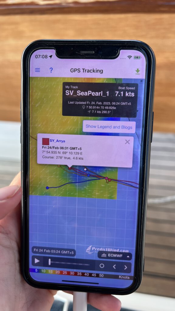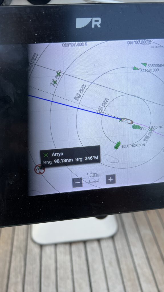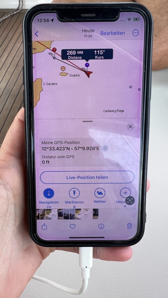 Wir sind deshalb froh, dass wir in einem großen Konvoi mit wenigen Tagen Abstand von 12 Schiffen mit wenigen Tagen Abstand aus Uligan aufbrechen. Wenn auch seltenst in Sichtweite, gibt uns das Wissen, dass da draußen noch andere Segler sind, ein gutes Gefühl. Mit allen tauschen wir deshalb die Satelliten-Kontaktdaten aus, sodass wir auf der Passage sehr intensiv in Kontakt mit anderen Booten stehen. Wir wollen aber nicht nur auf die Sicherheit in der Gruppe setzen. Zusätzlich melden wir uns beim UKMTO (Britische Seehandelsorganisation), der Bundespolizei See und dem MSCHOA (Militärische Koordinierungsstelle rund um das Horn von Afrika) an. Wir begeben uns so zwar unter ein striktes militärisches Protokoll, werden aber von den Einheiten ebenfalls beobachtet und können so im Fall der Fälle mit schneller Hilfe rechnen und erhalten auch umgekehrt Informationen zur allgemeinen Lage in der Region und auf unserer Route. Ab Abfahrt von den Malediven senden wir also jeden Tag um 08:00 UTC unsere Positionsmeldung sowie die aktuellen Fahrtdaten an diese beiden Organisationen. Auch wenn uns diese Abläufe ja Sicherheit bringen sollen, trägt allein die Tatsache das tun zu müssen zur Anspannung bei.