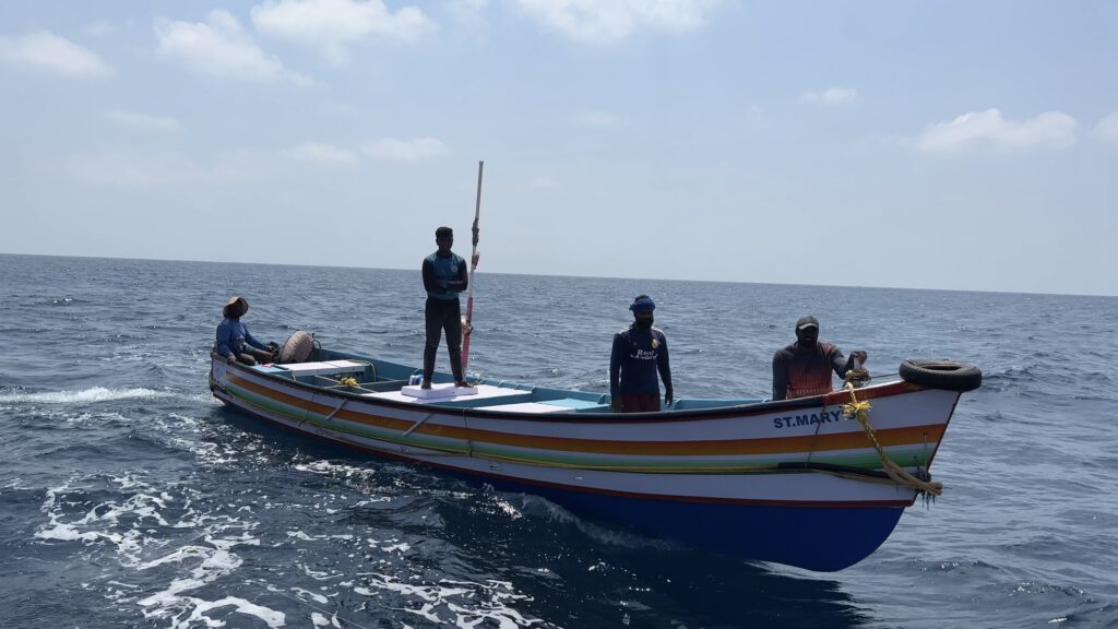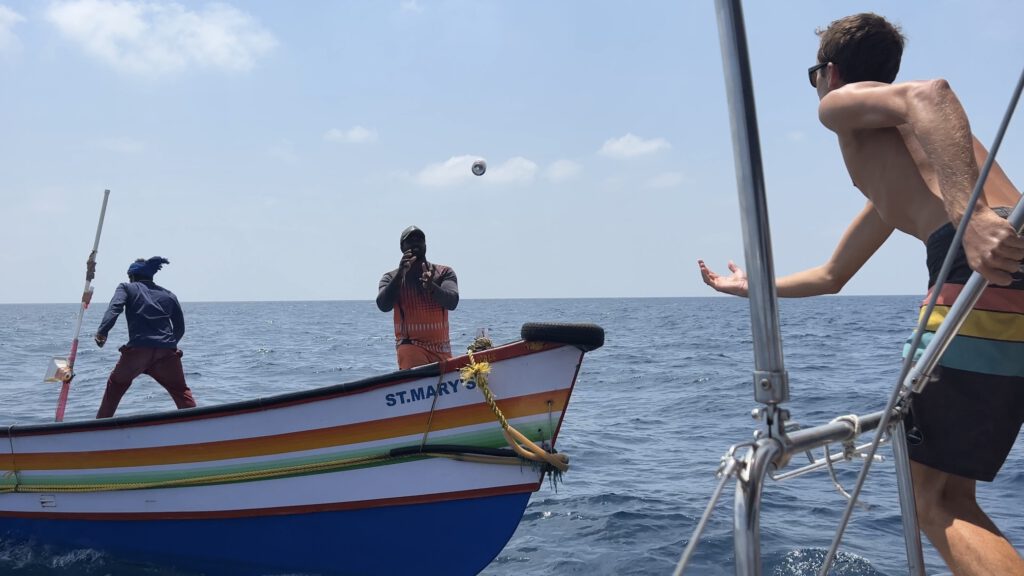 Nach ein paar Tagen sorgt aber eine Angewohnheit der Fischer im indischen Ozean leider regelmäßig für einen Adrenalinschub. Die Fischer im indischen Ozean operieren oft von Mutterschiffen aus mit kleinen, offenen Booten aus denen Sie mit konventionellen Leinen angeln. Wenn diese kleinen offenen Boote mit drei Mann Besatzung mit einem Turban oder halb verdecktem Gesicht als Sonnenschutz mit voller Fahrt, mehrere hundert Meilen von der nächsten Küste entfernt, auf uns zuhalten oder kryptische Funknachrichten absetzen, haben wir leider viel zu oft das Bild eines Piratenangriffs vor Augen. Wir gehen im Kopf Notrollen durch, manchmal versteckt sich Luisa unter Deck. Wir befinden uns noch gar nicht nahe an der somalischen Küste und also nicht im typischen Operationsgebiet der früheren somalischen Piraten. Aufgrund der ständigen Auseinandersetzung mit diesem Thema fahren solche Gedanken aber leider mit. In keinem Fall wollen diese Fischer uns aber etwas Böses und wir müssen mehr als einmal unsere Vorurteile relativieren. Typischerweise werden wir nach Zigaretten oder etwas zu trinken, meist Bier, gefragt. Manchmal auch nach Lebensmitteln wie Reis, Mehl oder Wasser. Es scheint uns, als ob diese Fischer einfach gelernt haben, dass weiße Segel am Horizont gleichbedeutend mit einem Kühlschrank und meist gut gefüllten Proviantlagern ist. Das sie sich aber per Handfunkgerät bei Ihrem Mutterschiff „in die Pause abmelden“, sorgt bei uns natürlich erstmal noch für mehr Unbehagen. In ihrem harten und tristen Alltag sind wir vermutlich einfach eine willkommene Abwechslung. Ihrer Wirkung auf uns Segler und die Assoziation mit den Piraten scheinen sie sich gar nicht bewusst zu sein. Ein Boot kommt uns so nahe, dass wir die drei Dosen Bier nicht in einer schwimm den Plastiktüte im Kielwasser übergeben sondern von Boot zu Boot werfen können. Bei der „Verabschiedung“ ruft uns dann einer der Männer wegen unserer deutschen Flagge am Heck noch zu: „Germany, Allemania, FC Bayern, Thomas Müller – Good Country“. Obwohl wir solche Begegnungen mehrfach erleben und auch alle anderen Boote auf der Passage von gleichen Vorkommnissen erzählen und niemandem etwas passiert, so ganz gewöhnen können wir uns an diese Annäherungen in diesem speziellen Seegebiet nicht.